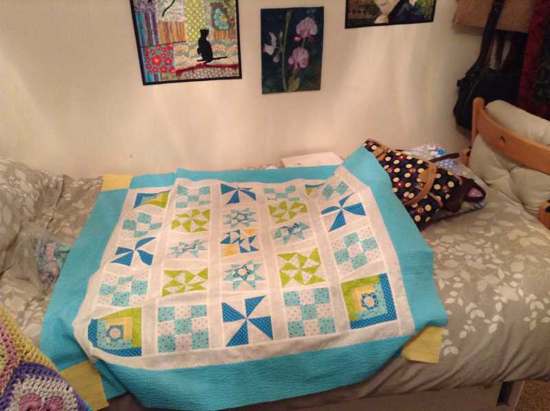 On the wall above the quilt is my quilt for Chinese Whispers, February entry I think. This challenge is still ongoing with the next show and tell at the end of July. Here is the group which has photos https://thequiltshow.com/community/member-groups/viewgroup/100006-chinese-whispers-for-anyone and the group description gives a bit of an explanation. The thread where we all chat or not is https://thequiltshow.com/forum/friendship-triangle-exchange/7079-cw-challenge-for-anyone-guide-on-1st-post?limitstart=0 Please join in, the more the merrier. I should be working on that soon as well