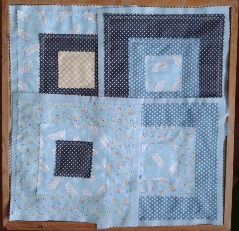 where I chose to work with a flannel sheet and attached Layer Cake squares then Charm squares and finally one of the small Mini Charms. All sewn down (Quilted) with a 3-step zigzag through all layers. With a bad back I wasn't going to repeat this anytime soon (very heavy to turn and keep the pieces from wandering) so decided this time around to work with a QAYG technique but apart from DH cutting all the fabrics chosen by DD with a wave blade in the cutter and altering the measurements slightly I'm working in the same way so flannel backing 11", 10" square on top then a 6" and finally a 3" square. I leave an edge to unravel by stitching 1/4 to 1/2" from the edge. I will sew the squares together with the SA on top of the work (did a small sample that DD approved) and Bob's your uncle so to speak.