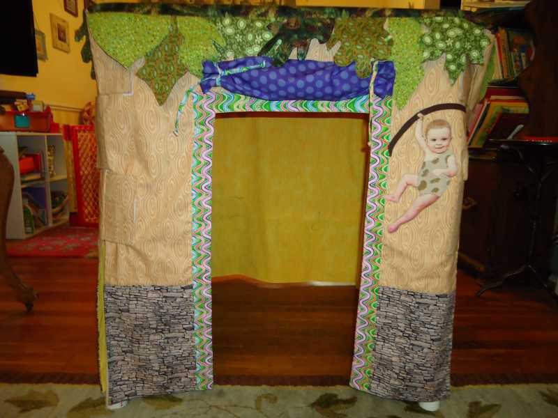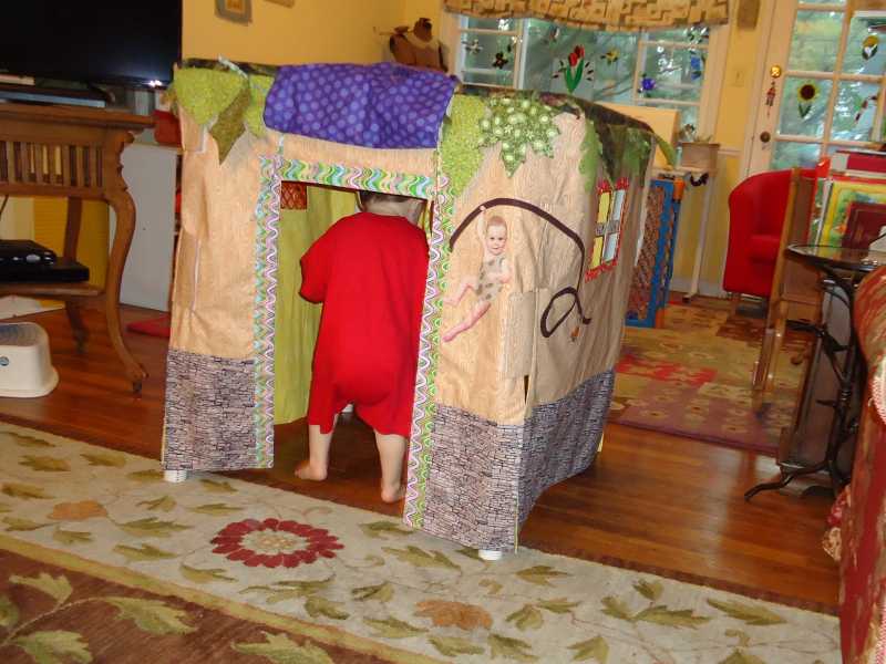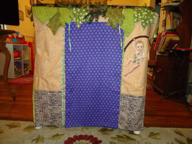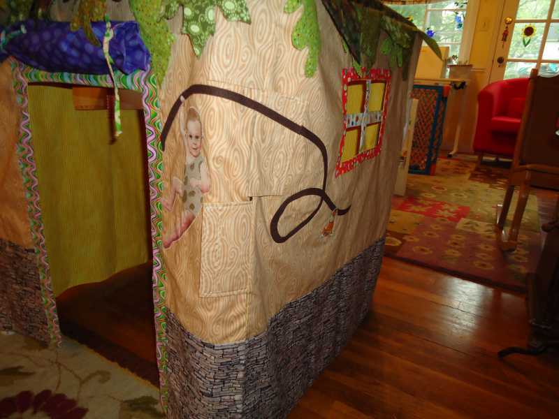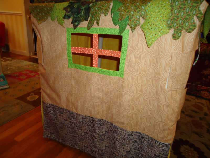 This isn't quilting but it's been so long since I got any sewing done, and our blogs have not returned YET (soon I hope) so I wanted to share my project with you. I hope you don't mind a ton of pictures because I'm so excited to have finished something. I made a card table playhouse for our granddaughter's first birthday last year and started planning one for our grandson who is a year younger. Well only 4 months late it's done. I wanted his to look more like a treehouse/fort with leaves hanging down instead of shingles like hers had following the pattern. That's our little wild guy swinging from a vine at the front door.