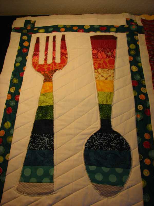 Luann, yes, a fork & spoon. I bought that pattern at Houston IQF this past year (that was so fun!!) and am working on the quilting of it now....I started it to match my Fiestaware dishes, but decided it doesn't match my dining room (it does match the dishes nicely), and so instead it's going to live with my sister. It's half quilted...just needs diagonal lines in the other direction and then binding.Originally posted by "AnnieLu" post=130570Heather I want to see more of the piece poking out from under your pile o placemats. It has a fork on it?