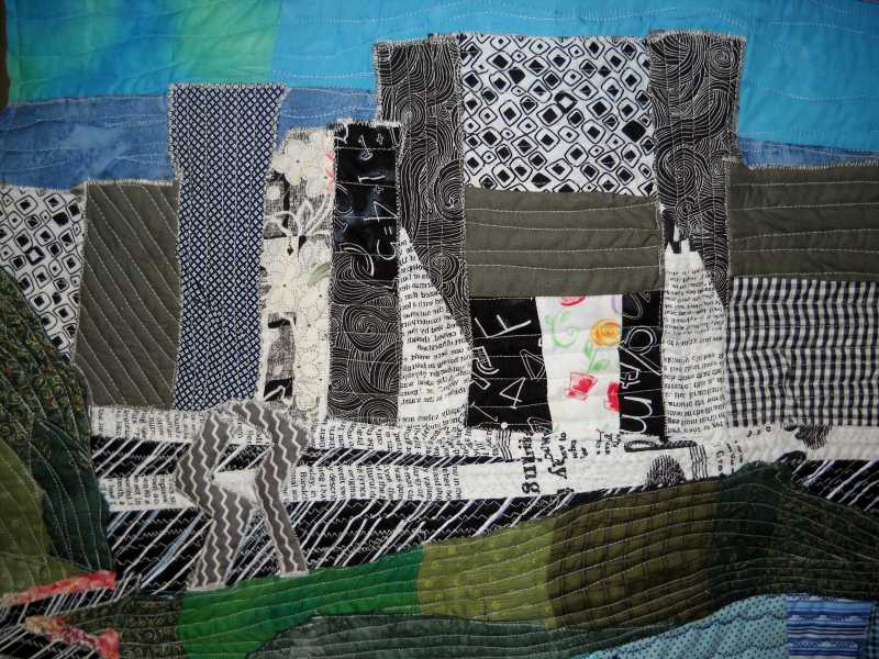 The piece on the wall was a challenge some time ago, to do something based on something we see. That's a rough representation of Sao Paulo, from our time in Brazil. I started with the SP (seen as a large concrete statue/sculpture along the highways there) and then did buildings behind and rainforest/water in front. Something of an art quilt, sort of....