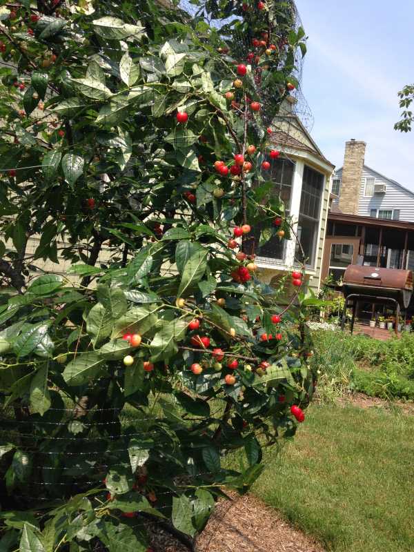 The tree is quite young. This is the first year we've gotten a crop. That's enough for a cherry pie. They are sour cherries. No one seems to grow them anymore and I can't figure out why. They are not prone to disease. They don't get wormy. No spraying. Tomorrow there will be as many more ripe one with the high temps today.