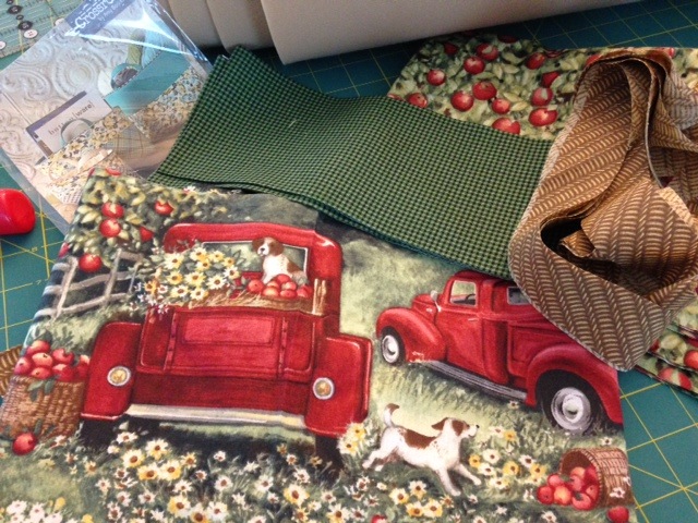 This fabric is cut and ready to sew into a cloth basket for my grandson toys. They have 2 dogs. BB is the spitting image of the little dog running at the base of the tuck. And Jet looks just like the dog sitting in the pickup. Couldn't believe I found that fabric. I got that stuff cut during the last 2 days.