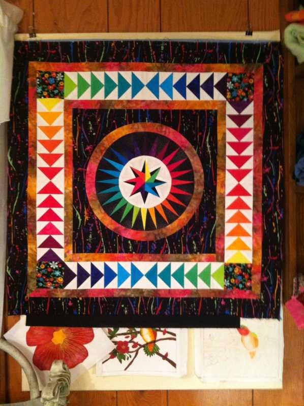 Rehak, I so envy you your Kansas Quilt show classes and lunch. I learned so much making Janet Stone's alphabet quilt last year. It is on a design wall awaiting it's turn to be quilted. Actually, I have been drawing quilting ideas and working up my quilting nerve! Jacquie Gehring's pattern inspired me to dye the color wheel. I was fairly happy with the results. Not pleased with my purples so I used a few store bought purples. The solid colors were my only dyed colors - the rest are store bought.