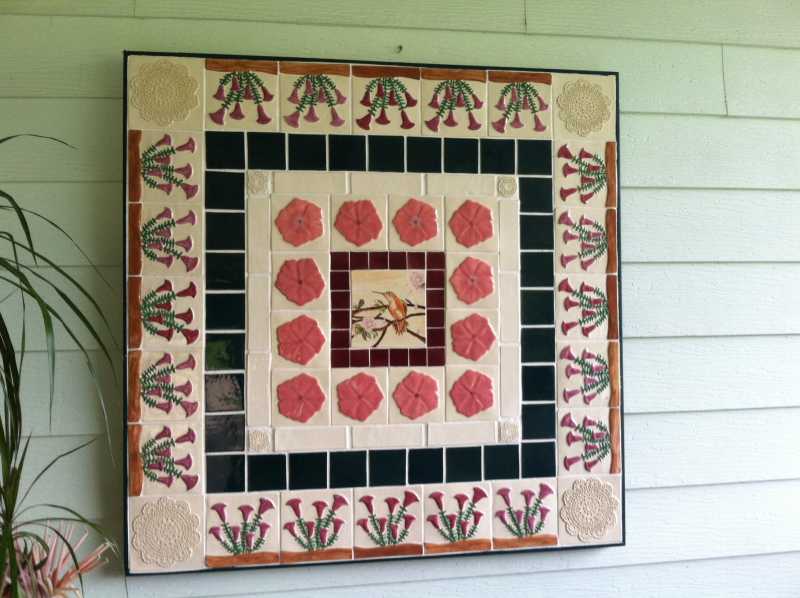 I used high fire stoneware clay to create the tiles. That means the clay body will not absorb moisture. The glaze is also able to withstand exterior elements. The piece I shared has hung on my carport for about fifteen years. I have other pieces hanging in various locations around my house. The largest tile mural I created was with 7th and 8th grade art students to honor the man their school was named after. It hangs on the side of the outside of the school.