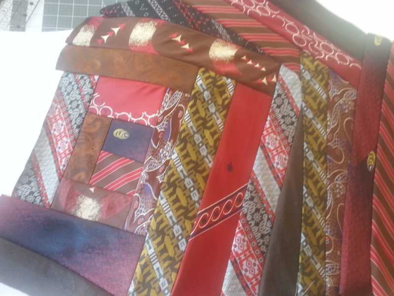 Marianne...I completely took the ties apart, ironed them out, made them into approx. 21/2 inch strips, then sewed them onto an 18x30 in-r-foam. It is a quilt as you go, improve style. Hope it looks ok when I get it finished :unsure: