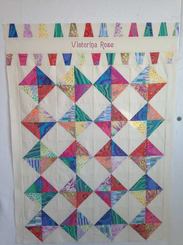Then I embroidered Victorina's name on her quilt and sewed it all together. That was an easy embroidery task. I'm very happy with the way it turned out. Now I will quilt it.
