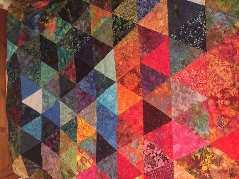 tomorrow? hopefully continuing on that triangle-quilt. Here's a partial of it spread out on my bed... Sorry too large totake a quick snap of the whole thing -