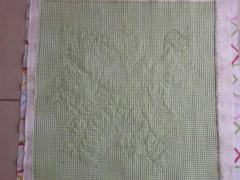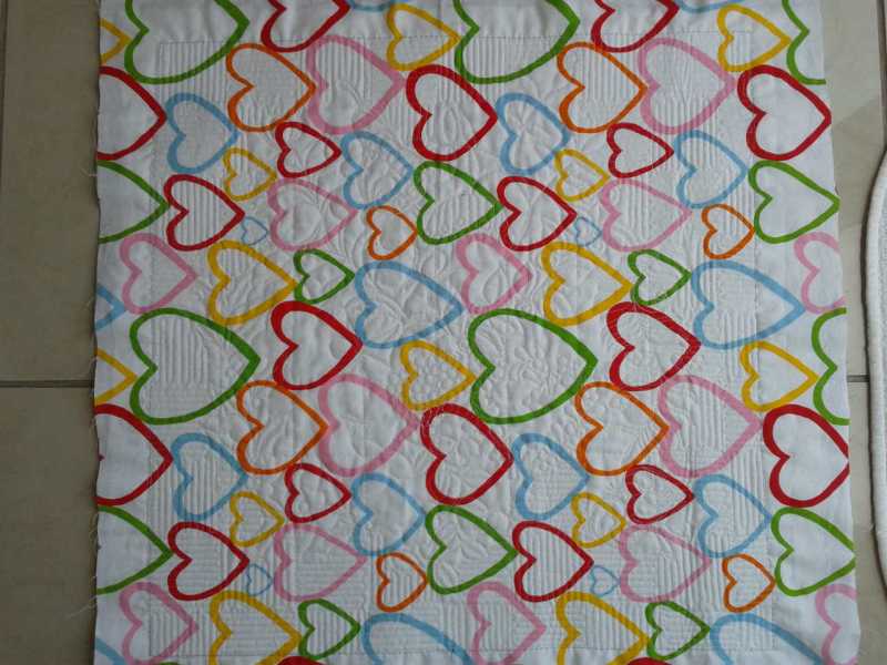 I've now finished my 4 FMQ samplers (feathers, leaves, flowers and berries) and can't decide whether to just leave them as samplers to refer to (they are about 21" square each) or join them and use them as a table topper in the kitchen; we have a very, very loved pine table in the kitchen 38 years ol so not quite an antigue but almost so it needs hiding from time to time when visitors come calling. The other 3 samplers are yellow, pink and light purple gingham respectively - not sure what to do. Input welcome. TIA