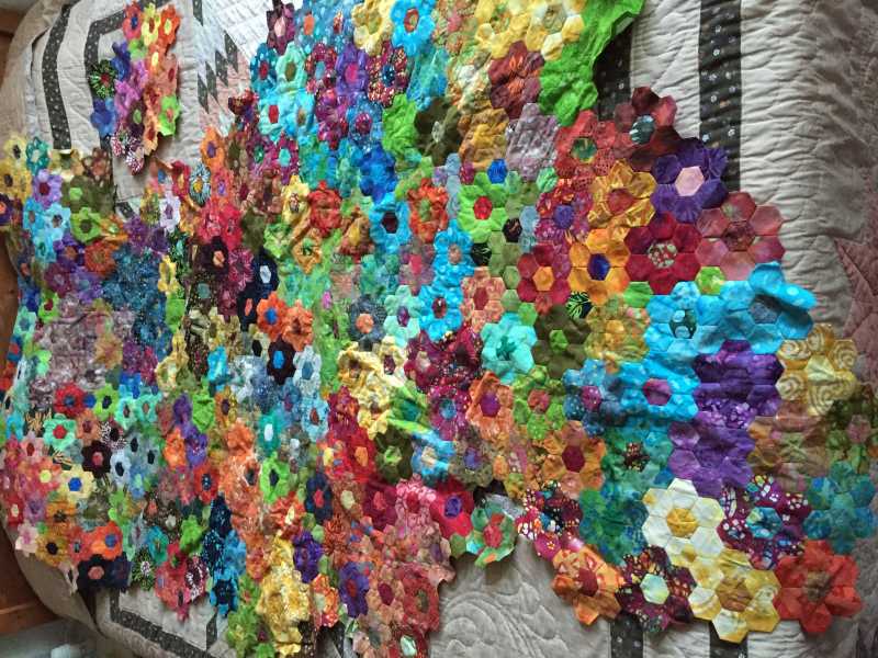 I've laid it out on my bed so you can get a feel of it... On the go I have a small Baggie with thread, needles, travel scissors and a bunch of hexies (the hexies are 5/8 inch per side / 1 1/4 inch diagonal), which I sew into pieces of 10-15 flowers. These go onto the large piece whenever I have a trip/visit where I can take larger bits... (a large bit that was done last winter when I had my knee fixed)... There are a bunch more small pieces waiting for attachment :P