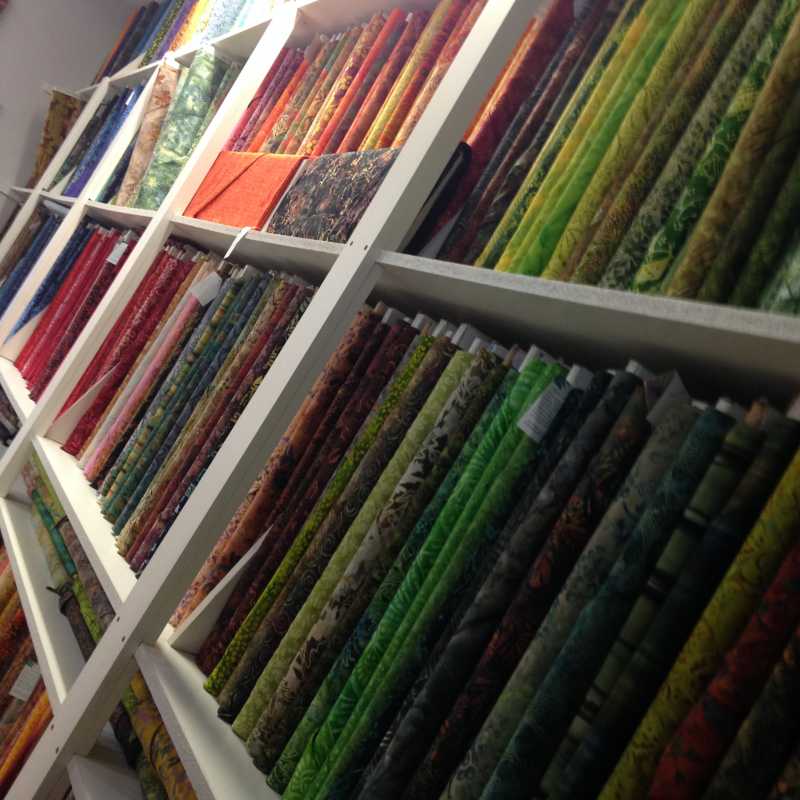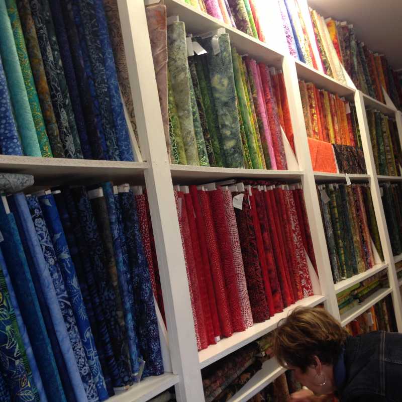 Today I went to the quilt hoarder lady shop. I think I told some of you about it. It's called the Sewing Basket and it's in Prosser, WA. I went with my new quilt group that I'm cheating on all of you with. :unsure: You can hardly walk around in this store as there is so much fabric. She has an old house filled to the brim, (even the bathroom is full of fabric!) and then a back building that has rows and rows of bolts of fabric 4 bolts high. It is so overwhelming! Here are some pictures of one of the batik walls.