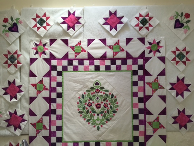 I am now working away on Wedding Quilt No 2 for my niece who is getting married in mid December. I still have quite a way to go with this one but I am getting there slowly but surely. This is how it looks so far. The centre medallion is from Sue Garman's 'Ruffled Roses' quilt here on TQS in 2011(?). My niece loves purple and pink, so that's what she is getting!