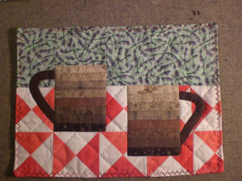 This is my top as a flimsy, it is partly quilted now and awaiting a lace doily to go into the space along with a couple of coffee mugs like the ones in this picture.