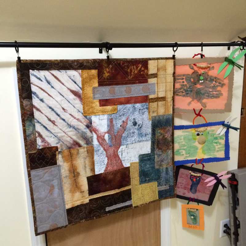 Now, I'm going to get a pot of tea and watch some Craftsy classes. I did finish the binding on Canberra Tree today. And it's hanging on a curtain rod in the long arm room, next to some fantastic art pieces from my Grandkids.