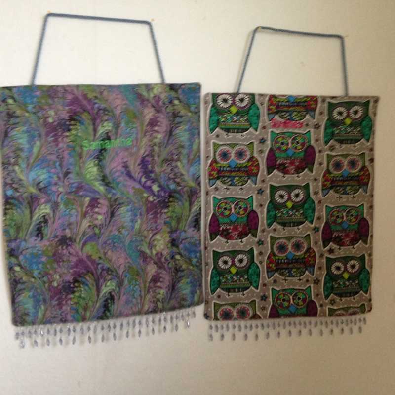 Here is a picture of the little wallhangings I made for my granddaughter's soccer patches. Lord knows how the patches will ever show up on these fabrics, but they each picked them out and there you go! Gotta love the beads that were "required".