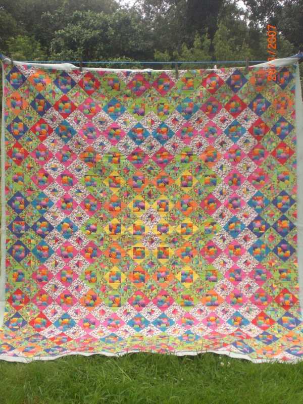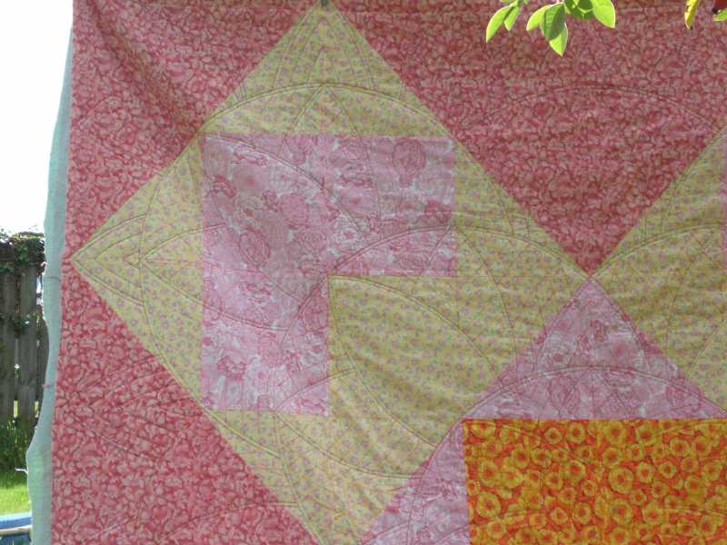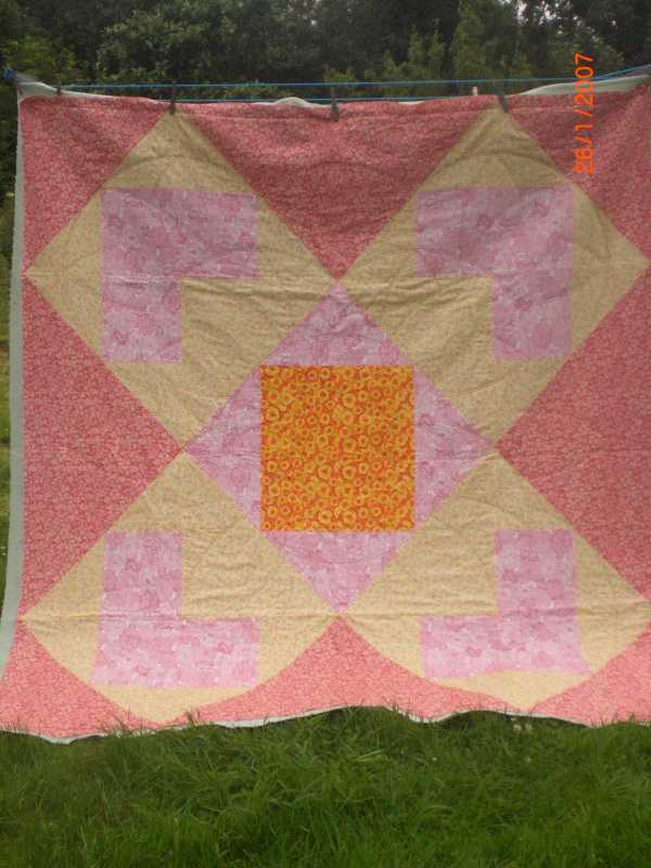 Reversible quilts are a good thing in my book - you get two tops to one piece of batting. My first full sized quilt was designed with the idea that I would make two tops exactly the same size and then put a blanket inbetween. (As opposed to my first two quilts which were quilt as you go). I started this before I found TQS and discovered that you are supposed to make the back larger than the front :whistle: . One side is very bright and has quite small piecing and the quilting doesn't really show up on it, and the other side was much larger piecing, softer colours and the quilting was designed to compliment this. This was pretty successful, although I probably spent longer crawling around the floor lining things up and pinning them into place. (I also think that I ended up adding a narrow scrappy border to the bright & busy side after the main 'bones' of the quilting design was put in, as it drew in a bit smaller.