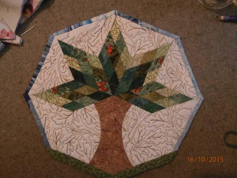 Finally got a finish :whistle: I was experimenting a couple of years ago and pieced this tree, then I quilted it with an all over design that is taken from a William Morris oakleaves design - lots of starts and stops :blink: , but I think it looks worth it. Then I put it by. Rediscovered it this week and combined with some of the contents of a scraps care parcel from Lorchan I finally put a binding on it. It measures 12 1/4" across from point to point, so that makes it too large for the FoQ miniatures section, but who cares, it makes me happy. :P