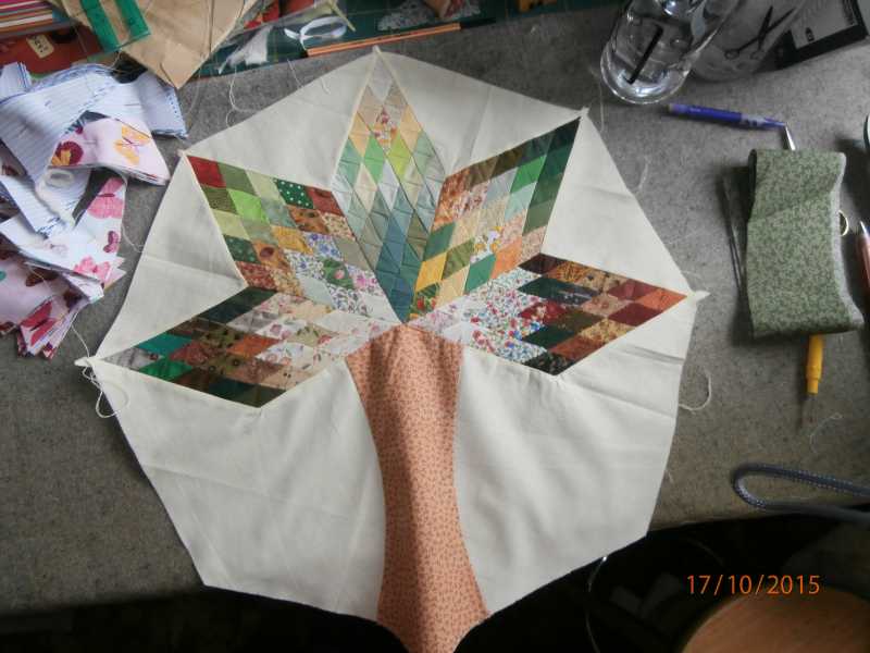 Here are pictures of the first tree I made to this pattern. It is all hand sewn and the diamonds were made from a packet of fabric samples that some shops send out, hence the seam down the middle (actually the seam down the middle is machined, but the rest of it is hand sewn) made several years ago whilst visiting the in-laws one Christmas. No it doesn't lay flat (yet) I just haven't go around to fixing it yet :whistle: