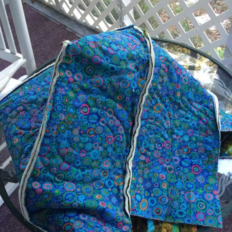 Quilted up 4 pieces for a modified mondo bag. Put a backing on the frame of my longarm, two very thin layers a batting, and laid the four pieces on top. I put a different design in each of those 8x26" pieces. Then I grabbed some squares of hand dyes I had and put a block pattern in each of those. I will have 8 squares, 8 1/2" each. They'll make large mug rugs or small pot holders! I've already assembled the four bag pieces into the basic shape. I'm thinking about covering all interior seams with binding and using the same for around the edge. But it would be faster to just make a liner, and then I could add pockets too.