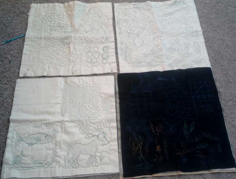 the demo from class were the things she showed in the last 10 to 15 mins, we were done, it wasn't 5 yet, so anyone who wanted to stay, she let us look at her quilts (she had brought several for show & tell) and ask her to demo whatever we wanted. So she demoed the puzzle pieces, and some daisies, and some other stuff. Gears....a sort of cathedral window thing...stuff like that. Spider webs...
