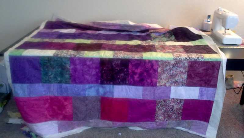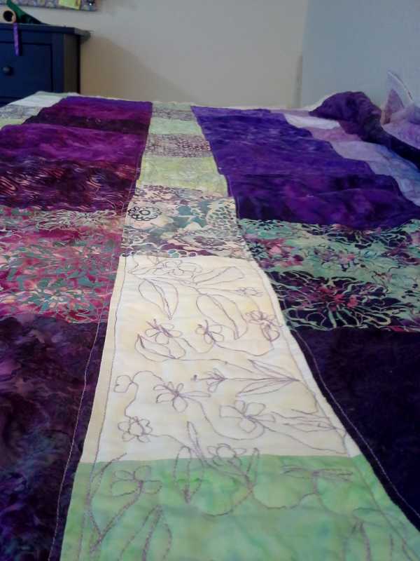 and what I've done since the halloween table runner --- this is Layer Cake Lemonade (a free Fat Quarter Shop pattern), in purple batiks, for my MIL. She asked a while back for a 'couch throw, in purple, if it isn't too much..." (as a gift, not to pay me, which is totally fine, she does so.very.much. for us; I delight in being able to give people quilts...). Since my FMQ class, I decided a simple layout so I can practice FMQing on a quilt for a person who won't notice mistakes or care about them anyway