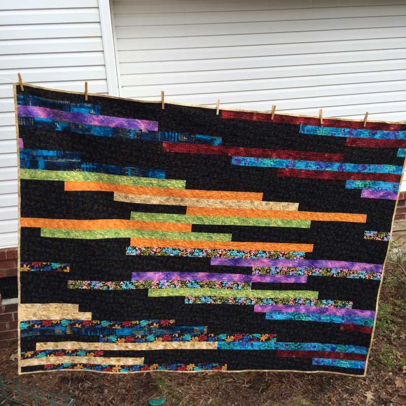 I used the jelly roll method. I cut strips from several favorite fabrics. Then I cut the same amount of strips from the black. It has grey oriental writing on it. I then sewed one favorite, one black, another favorite, another black, etc end-to-end. Then I did the jelly roll racing with that. I fmq it 2 1/2 years ago, while in GreenBay, WI. I used glide in a golden color, did a cursive L and loops. I really like how it turned out and it encourages me to just turn Abigail on and get to work!