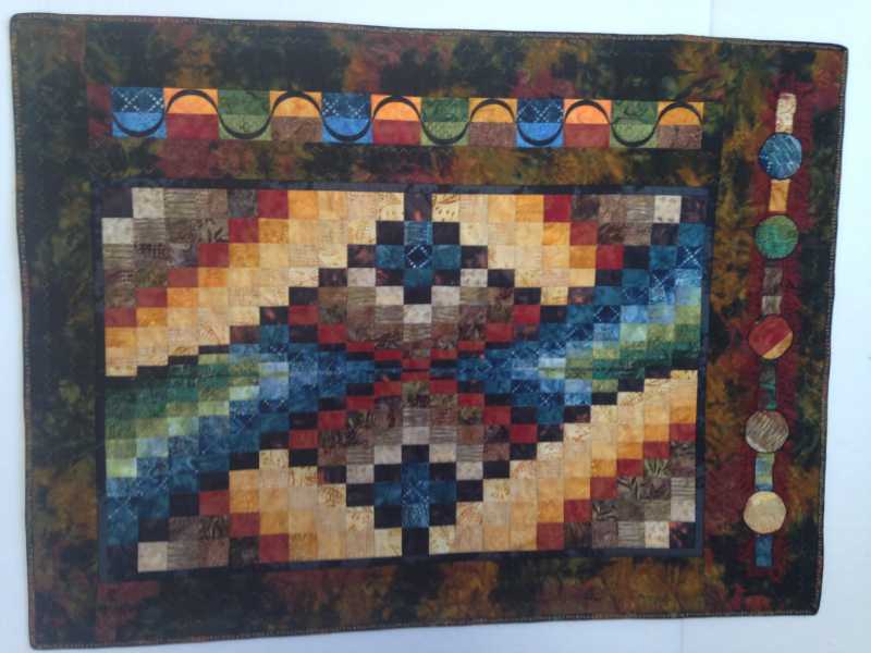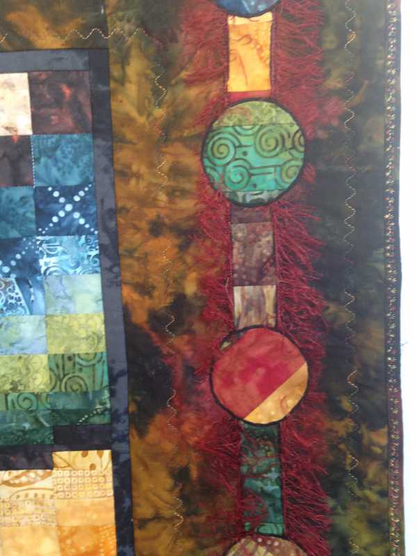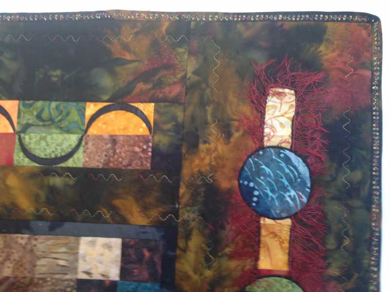 Here are some close ups. As I stared at the quilt I felt it needed some sort of extra binding treatment to contain it all. I wanted to put a small 1/8" flange on the binding but since Sybil decided to go up and live with Mr. Fix it, I don't have a walking foot to use for Constance. I knew I would just be frustrated trying to sew through 6 layers of fabric and cotton batting without the walking foot. So I used a decorative stitch Constance had and I like it better.