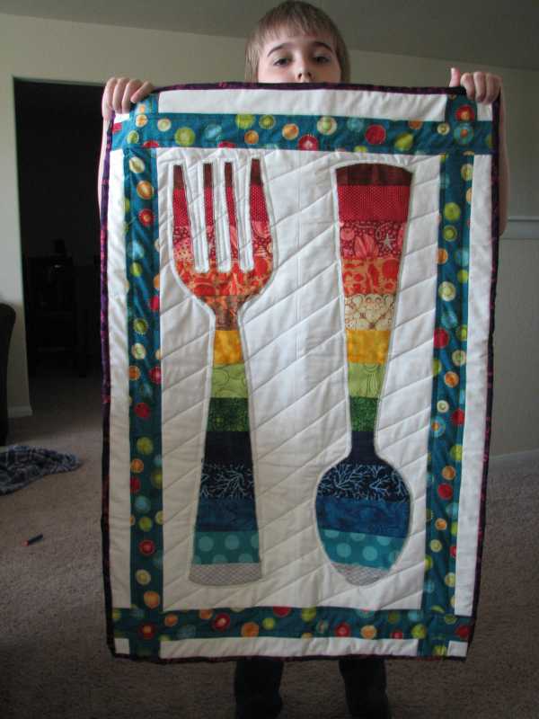 I have got some stuff done, finally!! I finished binding the spoon/fork table runner, in purple, for my sister. Then found little buttons I bought at Houston last year, which I meant to put in the corners, so will do that before sending it to her.
