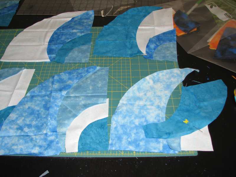 this is 4 of them so far, there are actually 8 that I have started -- this is when it was 2 curves together, and I was pinning the 3rd curve on. I've since sewn the 3rd curve to these 8 in this color-way, and will do the 4th curve and then the 5th/final curve, then move on to the next color way. This is the Radiant Suns pattern, though I'm subbing in some other blocks to add an oversized star block and a compass block, and then doing the "starry night" coloring, but using some suns as moons, and some as suns, and so some daytime blues (these) and some nighttime blues (next up), and some that will be mixed.