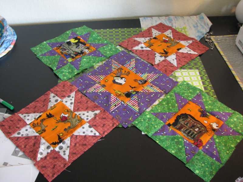 Also did blocks for a Halloween themed table runner; I need to return to buy fabric to make setting triangles, but will go this weekend for that, as my husband picked out the fat quarters I used (I made him come with me to the sale last week), and so he wants to pick out the fabric for the rest, too.