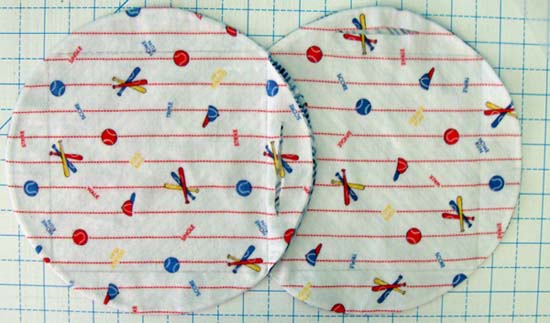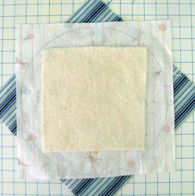 Lightly baste the batting square to one of the fabrics before you turn the circle right side out. This is fun to make, so the next one I will use regular cotton fabric and add batting.