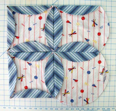 Turn the circle right sides out through the slit. Be sure to use a turning tool (I use a bone folder) to run along the entire inside of the seam to get a crisp even circle, then press. You'll want to be sure that the front fabric does not show on the back of the circle so that when you fold a flap forward it won't show. Mark a square in the circle (these are your seam lines for joining the circles). If you don't have a template, simply fold the circle in half and half again and put a mark at the fold lines on the edge, then draw lines to connect the four points.