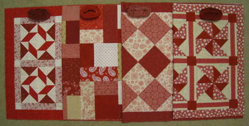 I finished piecing 4 red and white wall quilts this week. That's 2 weeks in a row now. Hope I can continue this for 2 more weeks. I want to get these behind me and move on to something else. I'm designing as I go and sometimes redesigning from making mistakes. That's what happens when you get in a hurry! The 2nd from the left is my version of a Turning Twenty quilt, using 21 squares of fabric 9-1/2" wide for 8" finished blocks. The one on the right was inspired by something on the daily blog this week. Make a guess as to what it was.