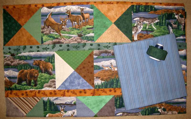 My DBIL's quilt is pieced. It finished at about 78" x 94". No borders, just fussy cut wildlife alternating with scrappy hourglass blocks, mostly a stash quilt. I purchased a light fabric and the backing. The main fabrics were from an estate sale a few years ago. I didn't make much of a dent in my stash. There's enough of these fabrics left to make another quilt!