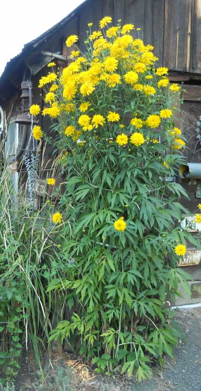 Marilyn, your husbands wood working is wonderful! Not sure re the flowers I think they're Dahlias, Dahlias can grow 7-8 feet tall, gorgeous flowers in the fall. We grew Dahlias when we lived in Washington state. The deer loved them, we'd dig up the root/tubers after the first frost and stored them in the garage over the winter. Replanted them again in the spring.