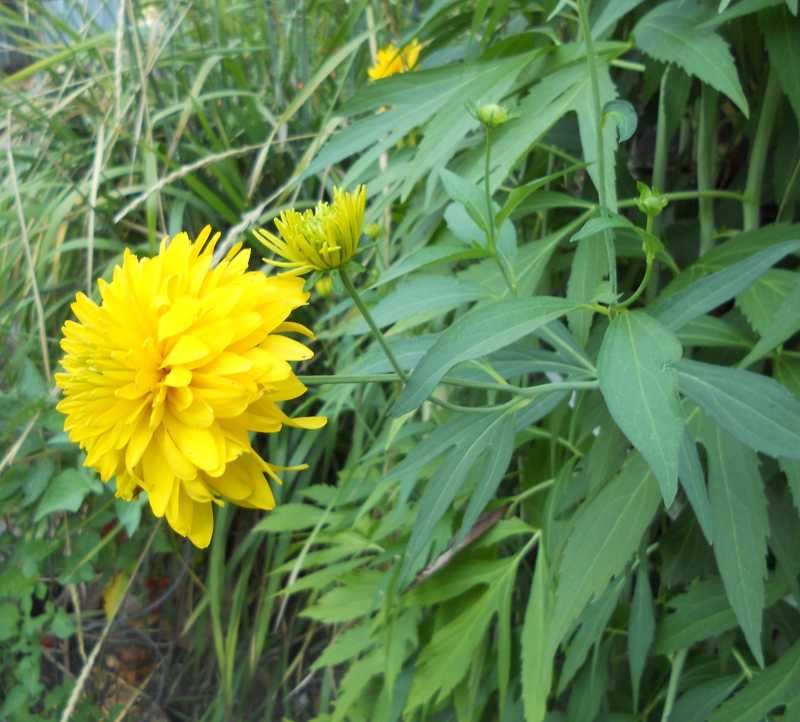 Anyway, the yellow flowers all tied up, and standing tall......they are the plant in question? I still say they are a variety of dahlia. The buds are a dead ringer for a dahlia bud. Can you take some leaves and a flower to a local nursery, and get an identification?