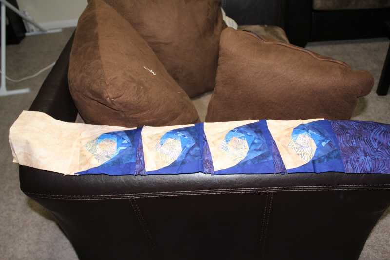 ...and, I got a lovely row from Jennifer/Jen! It is much prettier in person than my photo shows, as the lighting would not cooperate with me, so washes out some of the fabrics (and laid on the arm of the couch as it is, looks much "wavier" than it actually is; it does lay flat in real life, no worries!)