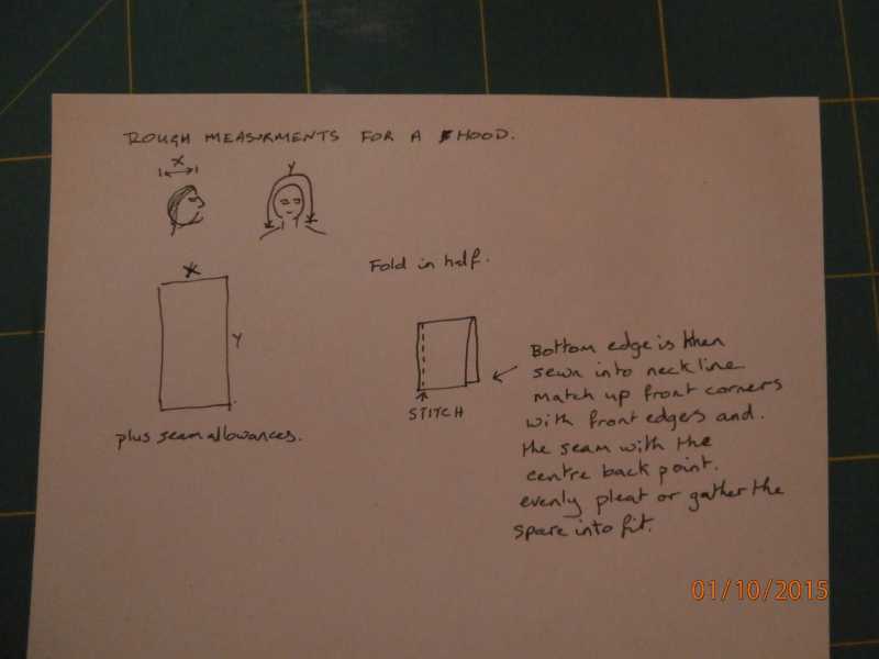 Here is a rough diagram of the basic style of hood I was thinking of. You could either put it into a full length cape, or a small 4"-6" wide shoulder covering cape. Or alternately put a channel along the bottom edge and add a draw string to gather it up and hold it on if you do this I would recommend that once the ribbon is in place to do a few stitches at the centre back to hold it, so that it cannot be pulled out and lost.