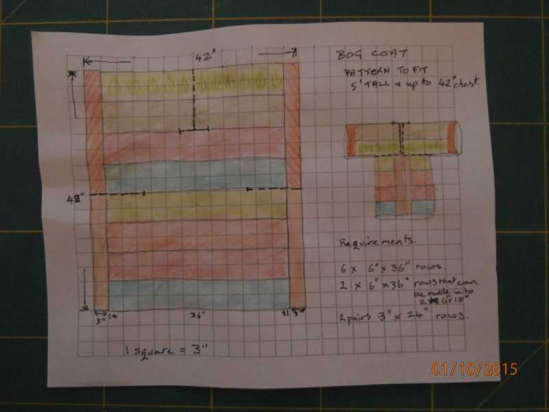 Next up After getting Izzy to do some measuring on me, I find that I need it to be 42" from wrist to wrist, and 36" long will take it from the nape of my neck to about knee length. Here is a sketch plan of how it could be constructed using the rows.