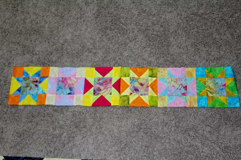 And, finally I am sharing pictures of the row Andree' sent me quite some time ago, and the row Cathy sent me this past week. Both are lovely! Beautiful blue waves (snail tail, is it called?? I don't remember, but like waves coming in from opposite sides) from Andree', and fun, bright batik stars from Cathy, which remind of all the fun colors on the beach -- beach umbrellas, beach blankets, beach toys, etc. Fun, bright summery colors. Both are just stunning and the photos don't do them justice. They are simply beautiful!