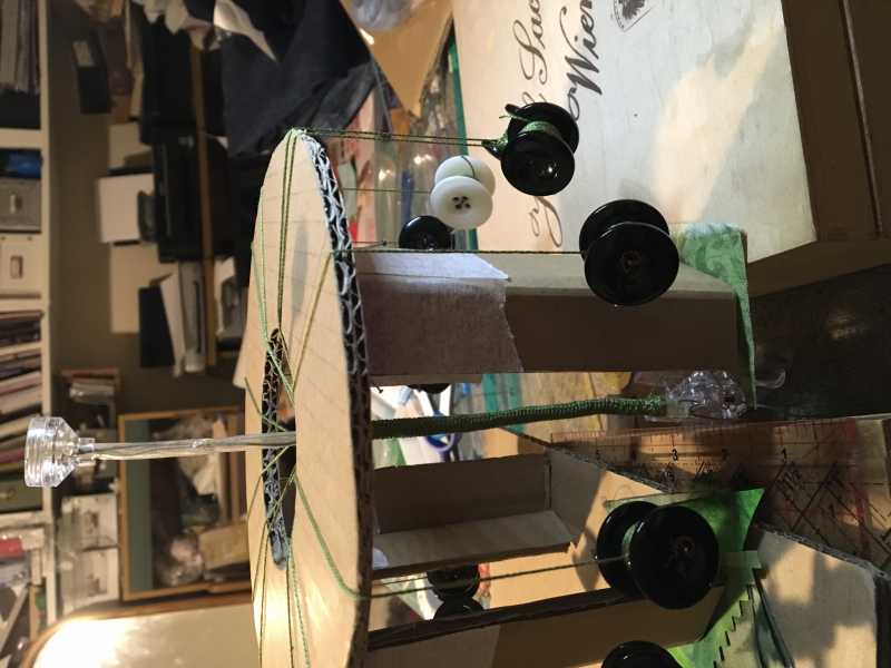 However, I have been concentrating a bit more on another project/line of study, which is 'The Cabinet of Curiosities' - an online university that is studying 17th century embroidered boxes, with the possible view to making your own. At the moment I am designing a modern small piece to keep in my box that will look like a tulip, but is actually a book light for added spot lighting whilst working on embroidery. Today, I made a Japanese style braiding stand out of cardboard and some bobbins to hold the threads on out of buttons and started braiding around the stem part of the light. Never done this before, but I think it is coming along pretty good, although I am wondering whether I really should have made more bobbins to take the no. of threads up to 16, instead of the 12 I have.