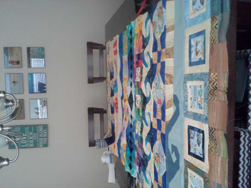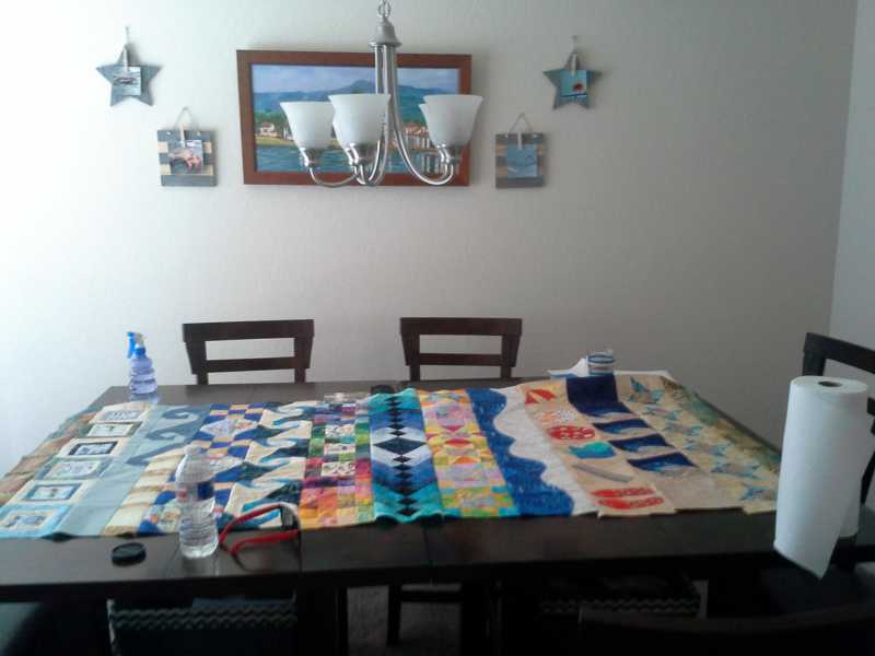 I don't know if I ever said, but I am using it as a table runner in my dining room, which is beach themed, for the parts of the year that don't have a holiday table runner. It's a bit wider than my other runners, but not so wide as to be odd, I don't think, and it looks fabulous in there. I also have place mats I"m finishing still (binding only) that will look lovely with this as well. Once I get the runner quilted and bound, and the placemats bound, I'll post a new pic, but for now....here is the top, loosely laid across my table.