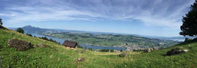 From my balcony (facing Southeast) I look straight at Mount Rigi (the Queen of Mountains). About half way up - more in the foreground is the first ‚step‘. Located a bit above and to the right of my feet you see an area where there are some free standing trees lined up on the steps crest. That is the Seebodenalp - in a good photo we would be able to see a large white building to the right of the trees, the Seebodenalp Hotel. It‘s about a two hour walk up to there - but there is also a gondola.