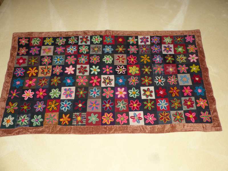 Are the flowers individual pieces stitched or are they solid pieces that have been cut out and stitched? Background fabrics look like a mix of wool and cotton? Is the border velvet? Any idea how old the quilt is? Based on age and condition I'd say $50 - $100 dollars??