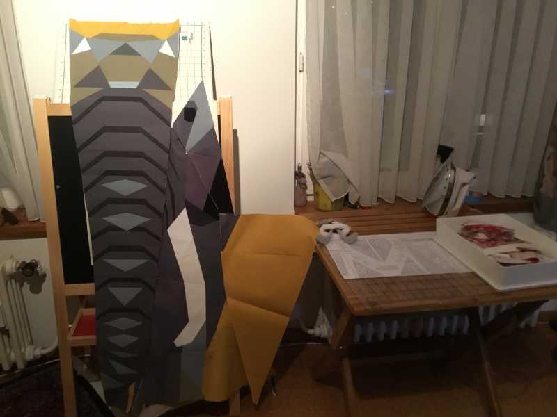 And because you had trouble recognizing my elephant, I just got out of bed, sewed the last few bits that were ready together and pinned them up. Elephant now has one eye, almost complete trunk and one tusk... there will be more head, ears and the other side - but not before I get back from New Orleans.
