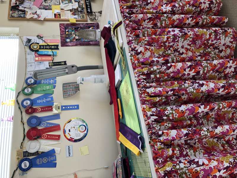 In any case, while I escaped I went to a fabric store and bought some new fabrics to make a little door that I dreamed of. I'm not finished yet. While at the fabric store I bought 4+ yards of a flat fold fabric and made a curtain to hang on my cutting/pressing table. Now all the chaos that I store under the table is out of sight! Yippee! And it gives the room a nicer look. And all for $7.99!