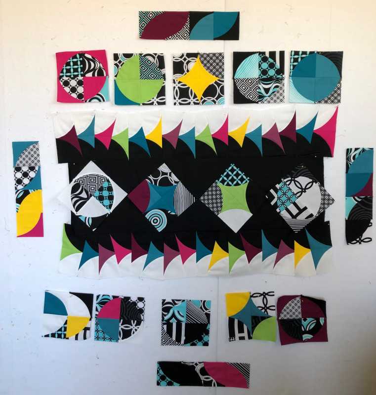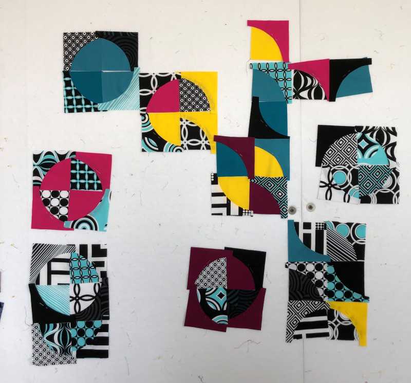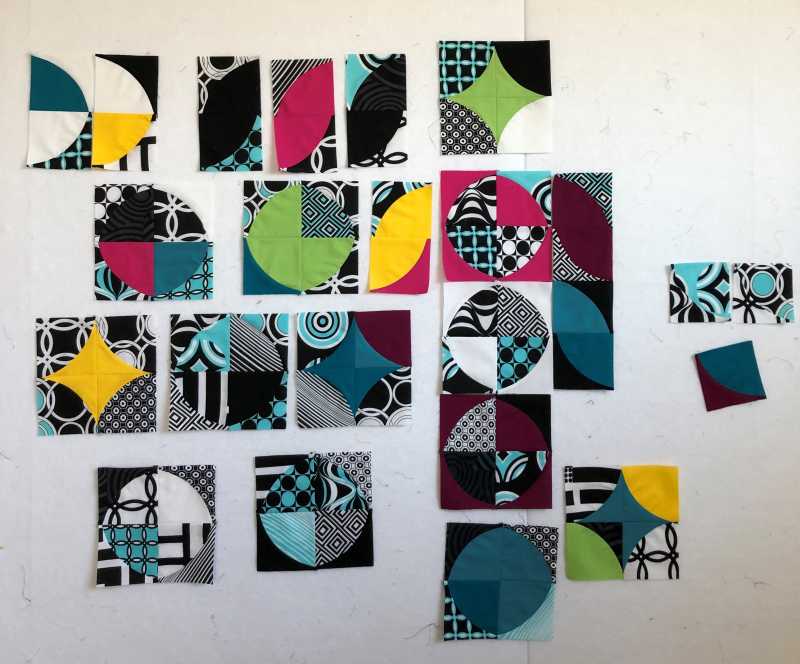 I found a charm pack of Op Art Reflections in my stash. It has to be several years old. I bought the QCR mini ruler at a quilt show last year and have had fun playing around with it. Then at our guild meeting they had a QCR book in the library! I'm not good at following a pattern. I'd rather make stuff and put it together in my own design. I started cutting up the drunkards path blocks using solids I had in my stash. I cut some, sewed some and did it again.