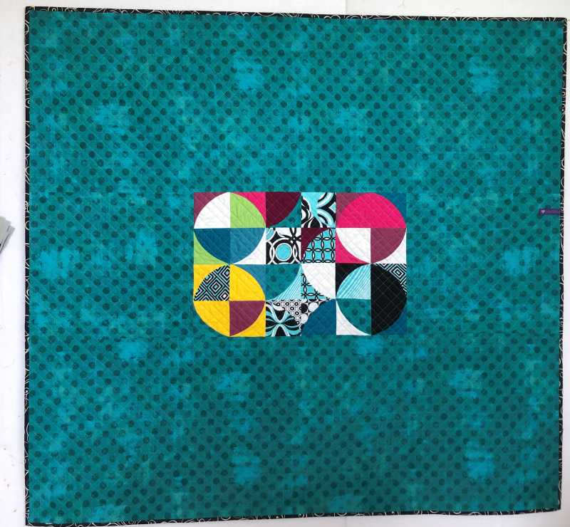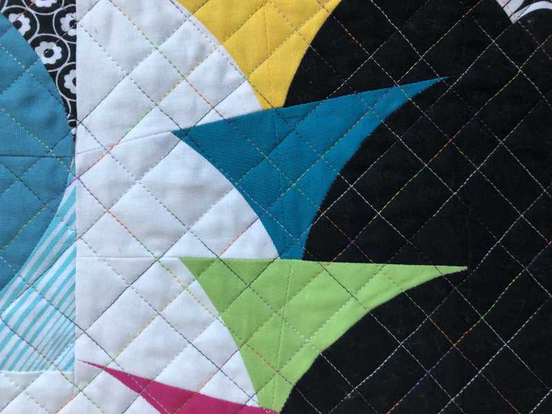 It was fun to make and I enjoyed the quilting. I used Superior Rainbows white and black for the majority of the quilting and then another variegated Superior thread for the in between lines. Found the binding in my stash. Except for the backing, it was all made from my stash. It's about 50" x 50".
