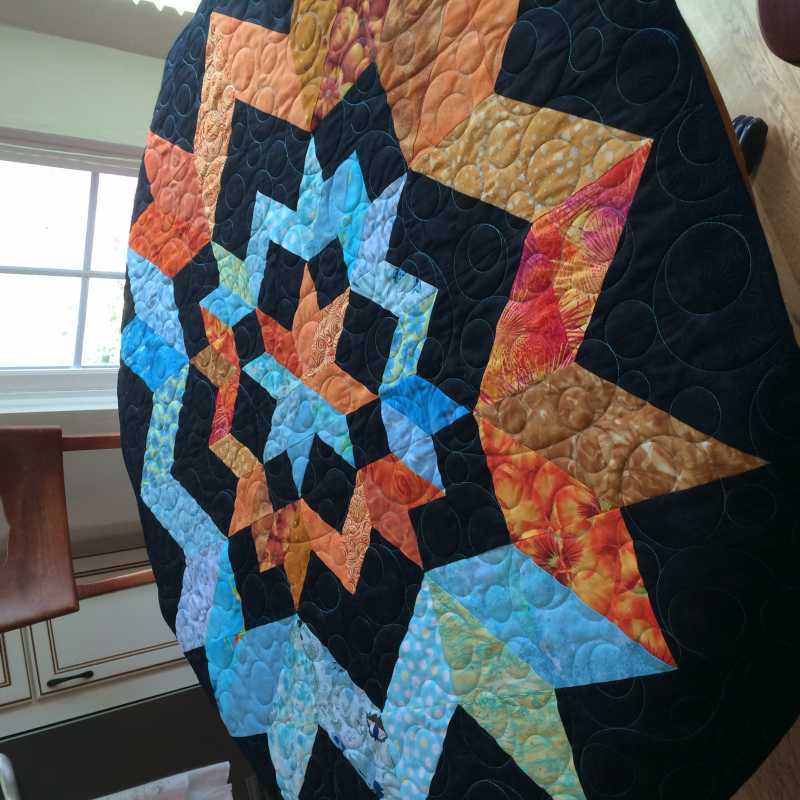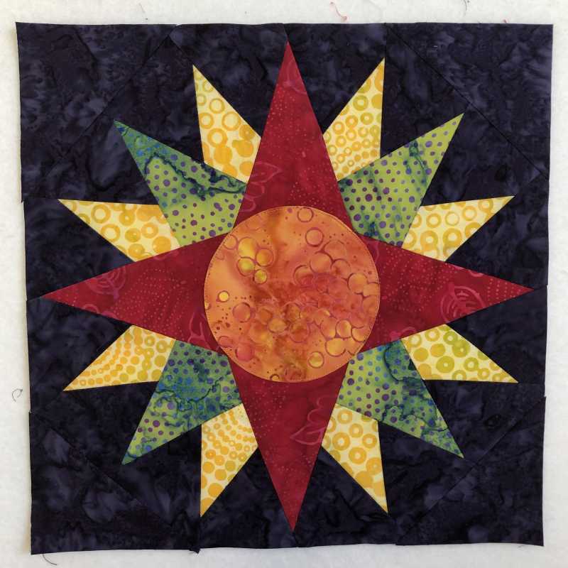 Tuesday our guild hosted Robin Ruth. She taught a class on how to make a Mariner's Compass using strip piecing. It was an awesome class! She is a great teacher. Her rulers are amazing and have the ability to make so many different types of Compass blocks from sizes 6" to 32". If you get a chance to take her class, I'd highly recommend it. Here's my sample I made in class. No circles were cut in the making of this piece!