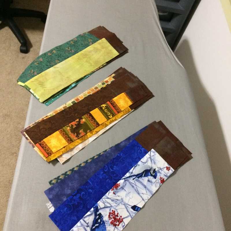 One of my grandsons is turning 16 on January 20th. Last fall when I visited with the family, I chatted with his mom about making him a more adult like quilt than I’d made him in the past. Actually looking at the pictures of those other quilts, I never made this child a ‘kiddy’ quilt, but I wanted to express my gratitude for having him as a grandchild, and I’ve decided that each child would get a ‘specially’ made for them quilt upon turning 16. Heather said, Oh my, I’ve been seeing these bookcase quilts. And this kid is always reading. So,,, here’s what I’ve done so far, 2 rows in process. And I have 3 piles of ‘book sets’ to make the other 3 rows. I do have a plan, but when you’re making up the pattern, things have to be adjusted sometimes. LOL Most of the time ! !